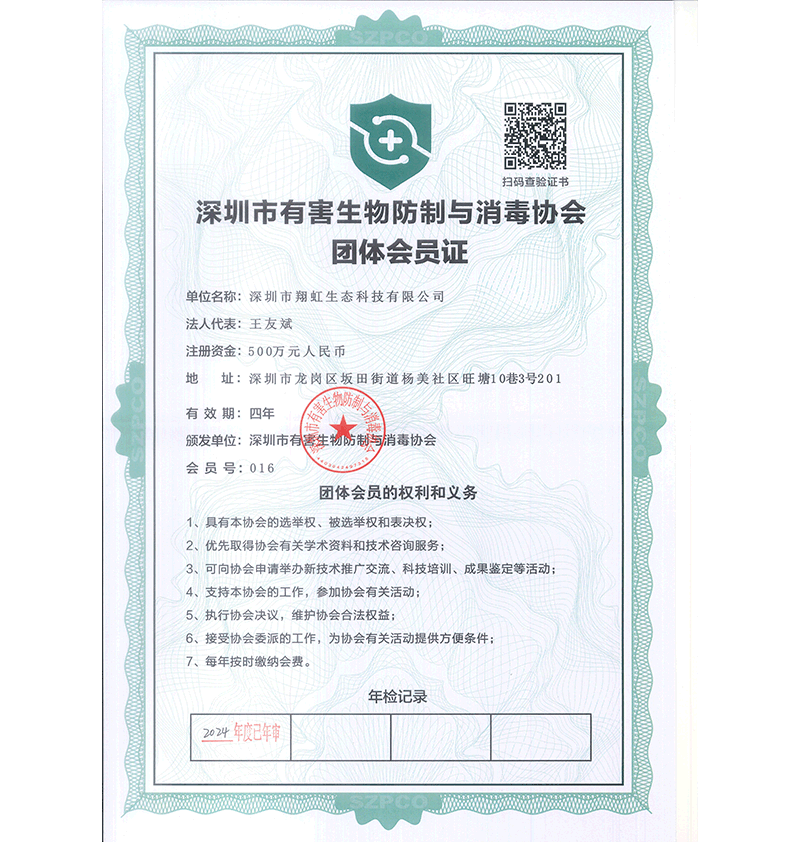 深圳市翔虹生態(tài)科技有限公司成立于1995年,是深圳最早成立的專業(yè)蟲(chóng)害防治公司之一。公司發(fā)展至今獲得全國(guó)有害生物防制服務(wù)A級(jí)資質(zhì)、廣東省有害生物防制服務(wù)A級(jí)資質(zhì)、深圳市有害生物防制服務(wù)A級(jí)資質(zhì)、廣東省有害生物防制服務(wù)A級(jí)資質(zhì)、深圳市有害生物防制服務(wù)甲級(jí)資質(zhì)的單位,是中國(guó)有害生物防治協(xié)會(huì)會(huì)員、廣東省有害生物防治協(xié)會(huì)會(huì)員、深圳市有害生物防治協(xié)會(huì)理事單位,多次獲得“深圳市十佳消殺單位”榮譽(yù)。